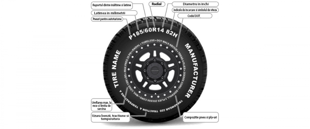 Flancul anvelopei conține multe informații importante care îți spun tot ce trebuie să știi despre cauciucurile tale. Numerele pot fi puțin intimidante pentru un ochi profan, așa că cea mai bună metodă de a citi/înțelege aceste marcaje este să luăm un exemplu și să îl studiem în detaliu. Anvelopa din imagine este P185/60R14. Primele cifre, respectiv 185 reprezintă lăţimea, în secţiune. Numărul 60 indică raportul dintre înălţime şi lăţime. Ultimul număr – 14 – indică diametrul roţii. Lăţimea Numerele din exemplu ne indică faptul că această anvelopă are 185 milimetri lăţime. Întotdeauna, primele numere din această serie se referă la lăţimea secţiunii anvelopei, adică distanţa dintre pereţii laterali/flancuri în milimetri, măsurată în partea de sus, deasupra benzii de rulare. Ca regulă generală, cu cât este mai mare primul număr, cu atât este mai lată anvelopa. Raportul înălțime/lățime Este raportul dintre înălțimea flancului și lățimea anvelopei. În exemplul de față, înălțimea flancului reprezintă 60% din lățimea anvelopei. Acest număr este unul dintre cei mai buni indicatori în alegerea unei anvelope, în sensul că, un flanc mai redus ca dimensiuni, să zicem 55 sau 50, asigură un răspuns mai bun la schimbările de direcție ale automobilului și, în general, o manevrabilitate mai bună. Flancurile înalte flexează în lateral, rezultând un grad de confort la rulare mai mare, în detrimentul manevrabilității. Flancurile înalte se regăsesc la anvelopele de off-road și vehiculele cu scop utilitar, în general. (R) Construcția internă „R”- ul se referă la construcția radială, metodă standard pentru producătorii de anvelope destinate automobilelor de pasageri, la nivel mondial, în ultimii 20 și ceva de ani. Înaintea anvelopelor radiale, majoritatea automobilelor erau echipate cu anvelope diagonale. Acestea din urmă, au inscripționat pe flanc litera B, sunt incă utilizate pentru câteva modele de camion, camionetă, furgonetă, motocicletă etc. Diametrul roții Acesta indică mărimea jantei pe care poate fi montată anvelopa, exprimată în inch. În cazul de față, singura janta pe care încape anvelopa din exemplu este una de 14 inch. Dacă ai de gând să treci la niște jante mai mari, ține cont de acest număr, trebuie să fie același cu diametrul noilor jante. Alte marcaje (82) Indicele de încărcare Acest indice indică greutatea maximă pe care o poate suporta din construcție, fiecare anvelopă. Cu cât este mai mare numărul, cu atât este mai mare și greutatea suportată. Este un indicator important, pentru că, înmulțit cu 4, el îți dă rezultatul greutății totale pe care o suportă un set de roți. În general, automobilele au înscris pe stickerul de pe stâlpul ușii șoferului, greutatea maximă suportată la plin, cu tot cu portbagaj și pasageri. Anumite vehicule sunt echipate cu anvelope inscripționate „XL”, vine de la „extra-load”, adică pot suporta o greutate mult mai mare decât anvelopele strandard. Trebuie să iei în considerare că există diferențe de măsurare între anvelopele din Statele Unite și cele din Europa la acest capitol. Dacă te afli în situații înlocuirii anvelopelor, ține cont și de acest indice pentru a evita o posibilă mare problemă. Dacă vrei o altă dimensiune de jantă, ține cont de faptul că o jantă mai mare pe un automobil, implică o anvelopă cu flanc mai mic. Asta se traduce și printr-un indice de încărcare mai mic, deoarece anvelopele cu profil redus au un volum de aer mai mic în ele, decât cele standard. Perna de aer din interior este cea care duce greutatea automobilului. Indicele de încărcare este important atunci când cumperi online anvelope noi, pentru că destul de mulți vânzători nu menționează care este sistemul folosit pentru măsurarea capacității de încărcare a anvelopelor. (H) Indicele de viteză Mulțumită acestui indicator, poți cunoaște viteza maximă cu care pneul a fost proiectat să ruleze pentru perioade de timp lungi. Litera „H” înseamnă că anvelopa rulează în siguranță până la viteza de 209 km/h, pe perioade îndelungate. Explodează dacă sari de această limită? Nu, nu imedit. Dar este posibil să se întâmple dacă mergi așa perioade îndelungate. Mai jos ai o listă cu indicii de viteză: S 180 km/h T 190 km/h U 200 km/h H 209 km/h V 240 km/h *Z peste 240 km/h *W 270 km/h *Y 299 km/h *(Y) peste 299 km/h *Indicele „Z” a fost cel mai mare existent o perioadă de timp, dar odată cu apariția și dezvoltare noilor tehnologii și automobile, cele mai mari rating-uri au devenit „W” și „Y” rating. De asemenea, există și marcajul „ZR”, care indică tot o viteză maximă foarte mare, folosit câteodată și în combinație cu W sau Y. Astea ar fi supreme, peste ele nu se poate momentan. Codul DOT Acest cod este utilizat de Departamentul de Transporturi (DOT) din Statele Unite pentru a urmări anvelopa, din faza de producție, în cazul unor rechemări sau retestări. Dacă un pneu se dovedește a fi defect, acest cod ajută la depistarea traseului și cumpărătorului final, astfel încât acest din urmă să fie informat despre problemă. La finalul codului DOT vei găsi un grup de patru cifre. Este data de fabricașie a pneului. Primele două cifre indică numarul săptămânii din an, iar ultimele indică anul fabricației. Spre exemplu, dacă ai pe pneu numarul 1616, acesta a fost produs în săptămâna a 16-cea din 2016. Dacă descoperi un cod de trei cifre, ai de-a face cu o anvelopă fabricată înainte de anul 2000. De exemplu, codul „145” indică faptul că a fost fabricată în săptămâna a 14-cea a celui de-al cincilea an al deceniului. Nu se poate spune sigur dacă este vorba despre 1995 sau 1996. Unele anvelope produse în anii 1990 pot avea un triunghi după codul DOT, pentru a preciza deceniul. Este i
