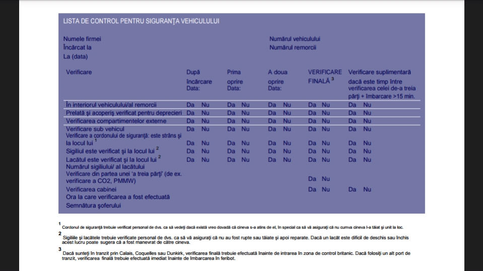 https://www.gov.uk/guidance/secure-your-vehicle-to-help-stop-illegal-immigration Ca un rezumat . Orice firma de transport care tranziteaza Uk trebuie sa respecte regulile de intrare /iesire de pe terioriul acesteia pe tema transportului iar pentru a evita patrunderea emigrantilor ilegali orice firma trebuie sa formeze soferii pentru procesul de verificare si asigurare a vehiculelor /ansamblelor . In firma se pastreaza dovada acestui curs , iar la bord trebuie sa existe un document , lista de control dupa care soferul trebuie sa verifice , asigure , consemneze ansamblul inainte de patrunderea in zona vamala . Firma e raspunzatoare de formarea soferilor si echiparea vehiculelor / ansamblurilor cu echipamente de securitate ( cabluri , lacate , sigilii etc ) iar soferii de efectuarea controlului . In cazul in care se depisteaza vreun emigran sau o incercare de patrindere se anunta politia la 112 , o interventie in forta fiind exclusa . In cazul in care se depisteaza un emigrant , dupa judecarea cazului, in care se observa o lipsa clara de formare , echipare si implicare a soferului firma e raspunzatoare de amenda .Amenda se poate trece la sofer daca firma a facut formarea si acesta nu a procedat corect sau pur si simplu nu a facut controlul , desi avea obligatia , prin incident de munca . Daca se observa o implicare a soferului pentru a introduce unul sau mai multi , in functie de gravitate ,amenda , inchisoare , restrictie teritoriu . Foto cu lista de control