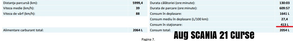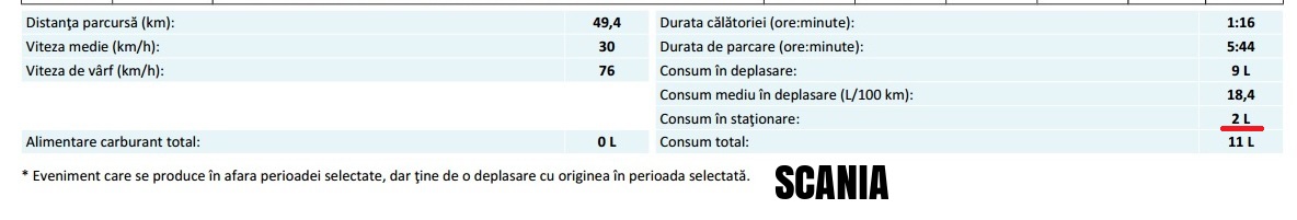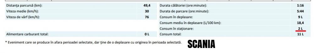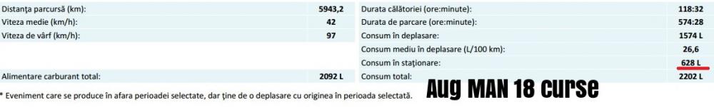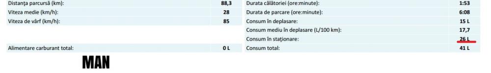Salutare tuturor, sunt nou pe acest forum si aceasta este prima postare. Nu stiu daca am ales sectiunea potrivita pentru acest topic. Ma ocup de monitorizarea a doua masini cu ajutorul softului ,,Easy track map" de la Tell Security Systems. Am nelamuriri referitoare la consum, mai exact la capitolul ,,consum in stationare". Firma la care lucrez se ocupa in principal cu transportul de persoane, dar patronul a achizitionat si doua masini pentru transport marfa marcile Scania si Man. Eu ma ocup doar de aceste doua, adica monitorizare, facturarea comenzilor, birotica, viramente bancare etc., urmeaza ca firma sa mareasca flota pentru marfa gradual si incet. Revenind la consumul in stationare, pe data de 30 aug 2016 ambele masini su efectuat cate o cursa ,,scurta". Consumul masinii Man este cel care a ridcat stegulete rosii. Atasez doua poze: Prima este Scania cu consumul mic si a 2-a Man-ul cu un consum suspect. Am sunat la dept. tehnic al Tell si tehnicianul mi-a spus ca ar fi fost niste fluctuatii si ca distanta e scurta si se intampla cu acest soft. De asemenea voi posta consumul pe luna august al ambelor masini si veti constata urmatorul fapt, consumul in stationare al Man-ului este semnificativ mai ridicat. Nota: Niciuna dintre masini nu are montat sistemul de monitorizare al capacului de la rezervor. Abia la anul vor fi montate si acestea, nici nu pot spune daca soferul Man-ului fura motorina sau nu, nici daca a observat lipsa gadgetului de la capacul razervorului. Alta suspinicune a fost aceea ca dupa efectuarea acelei curse scurte a fost pentru PRIMA data cand soferul m-a sunat sa ma intrebe ca fapt divers cum a fost consumul, niciodata nu a mai sunat sa intrebe despre consum la finalul curselor anterioare. Sper sa gasesc eventuale sfaturi la utilizatorii cu experienta ai acestui forum referitor la graficele postate, lamuriri vis-a-vis de consumul in stationare si eventuale pareri /indrumari despre sfoturile de monitorizare sau alte programe. Va multumesc !